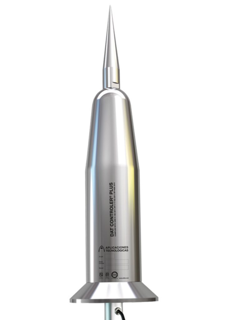 O desempenho do DAT CONTROLER é validado por certificação internacional específica para sistemas de proteção ativa contra descargas atmosféricas, com destaque para a AENOR RP 058.02, aplicada a para-raios baseados em antecipação do traçador ascendente.